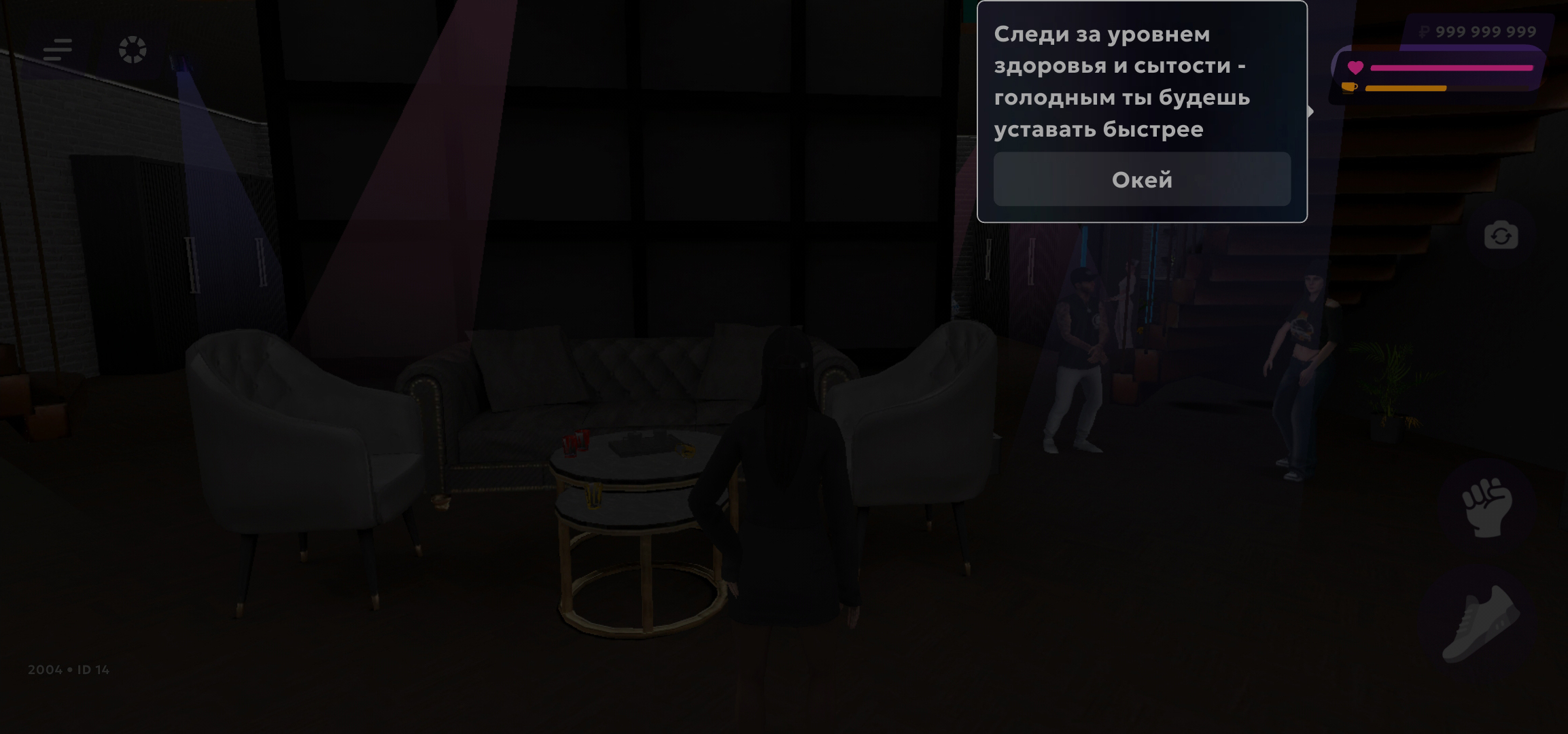 По пути к выходу появится подсказка об уровне здоровья и сытости. Также тебе нужно будет открыть инвентарь и съесть сэндвич.