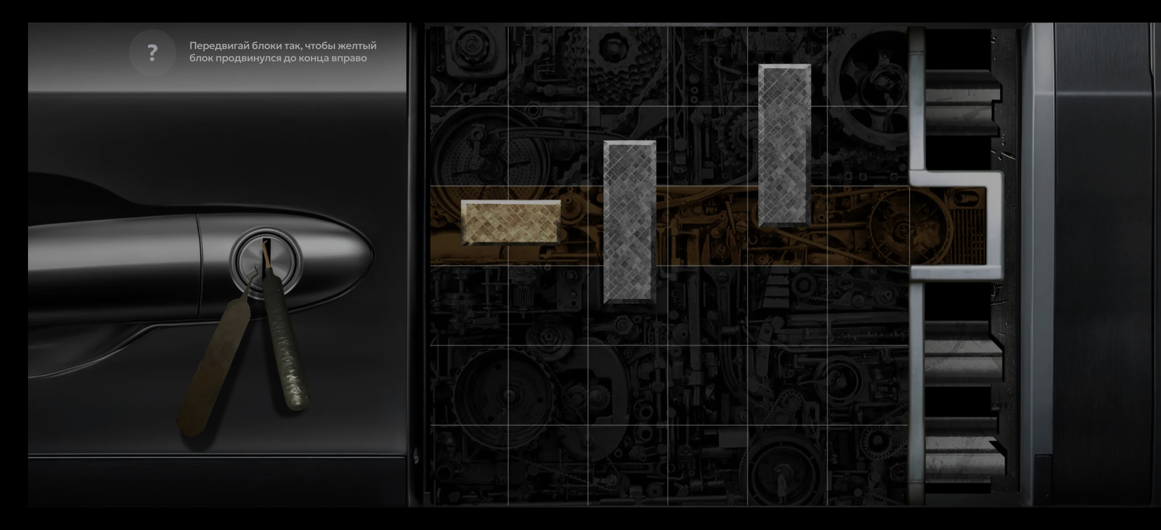 Взлом происходит через мини-игру: нужно передвигать блоки так, чтобы жёлтый блок-отмычка смог пройти к выходу (его также нужно двигать самостоятельно).