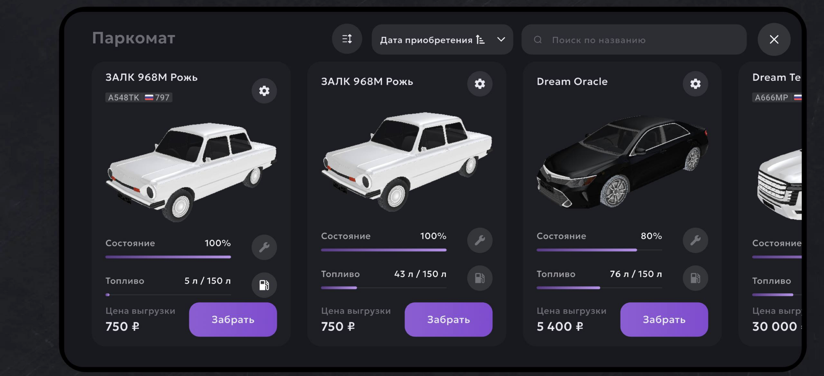 В меню ты увидишь список твоего транспорта, его состояние, количество топлива, номер и цену за выгрузку. Ты можешь найти нужный автомобиль по карточкам или по названию в поиске сверху.