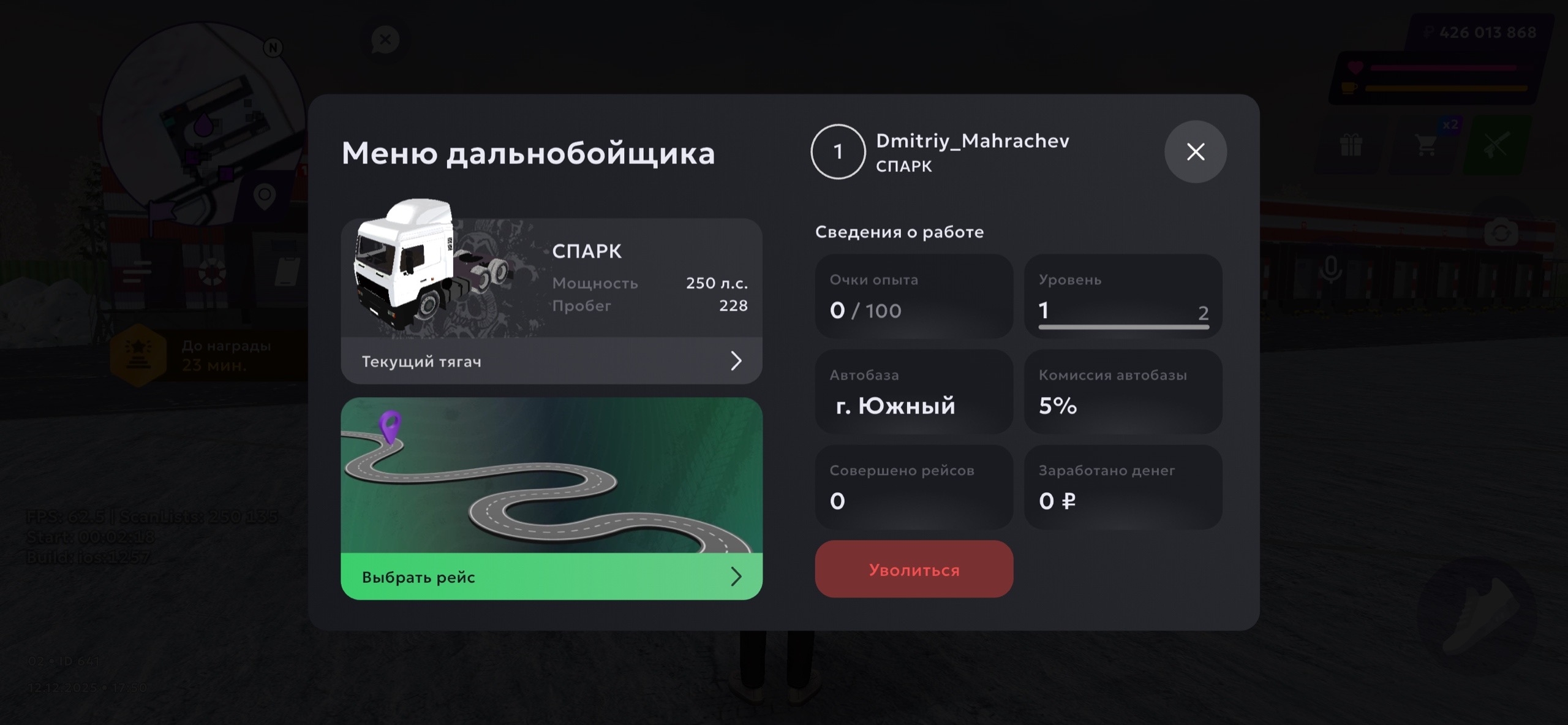 Чтобы завершить смену, просто выйди из грузовика. Если хочешь уволиться — вернись на автобазу, где устроился.