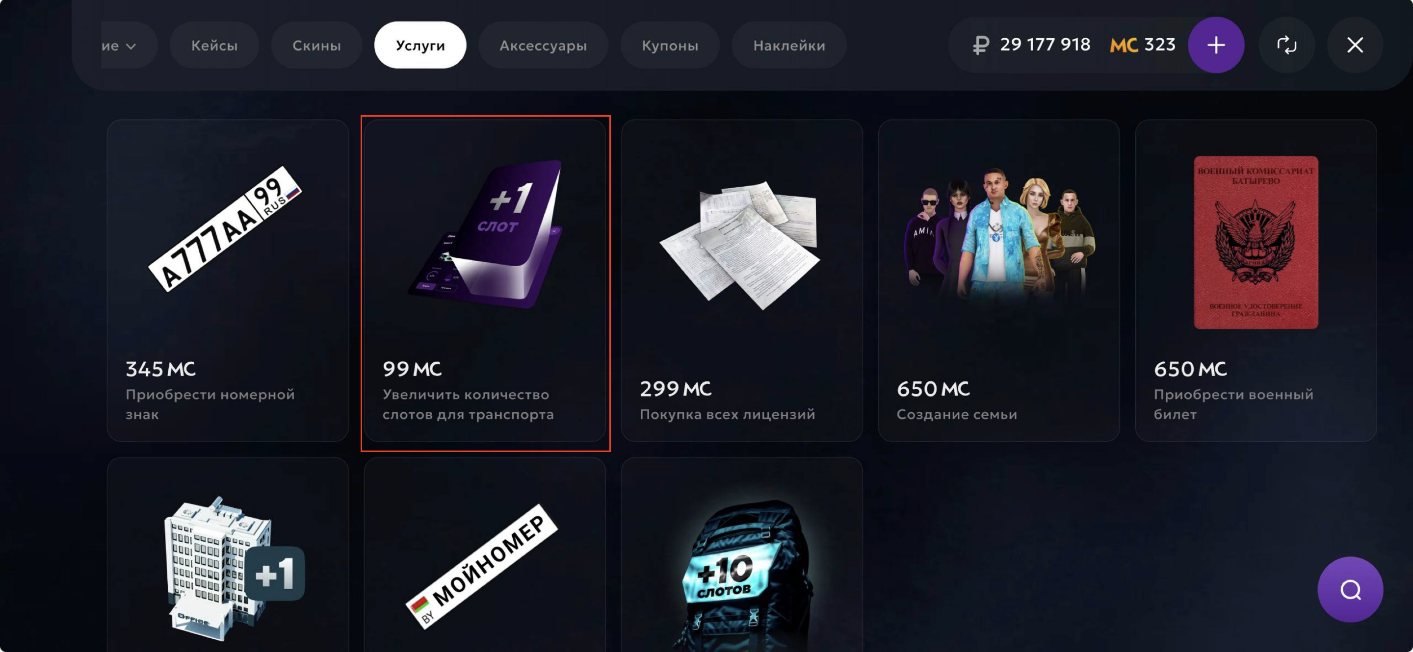 В донат-магазине слоты находятся в разделе «Услуги» и стоят 99 МС.