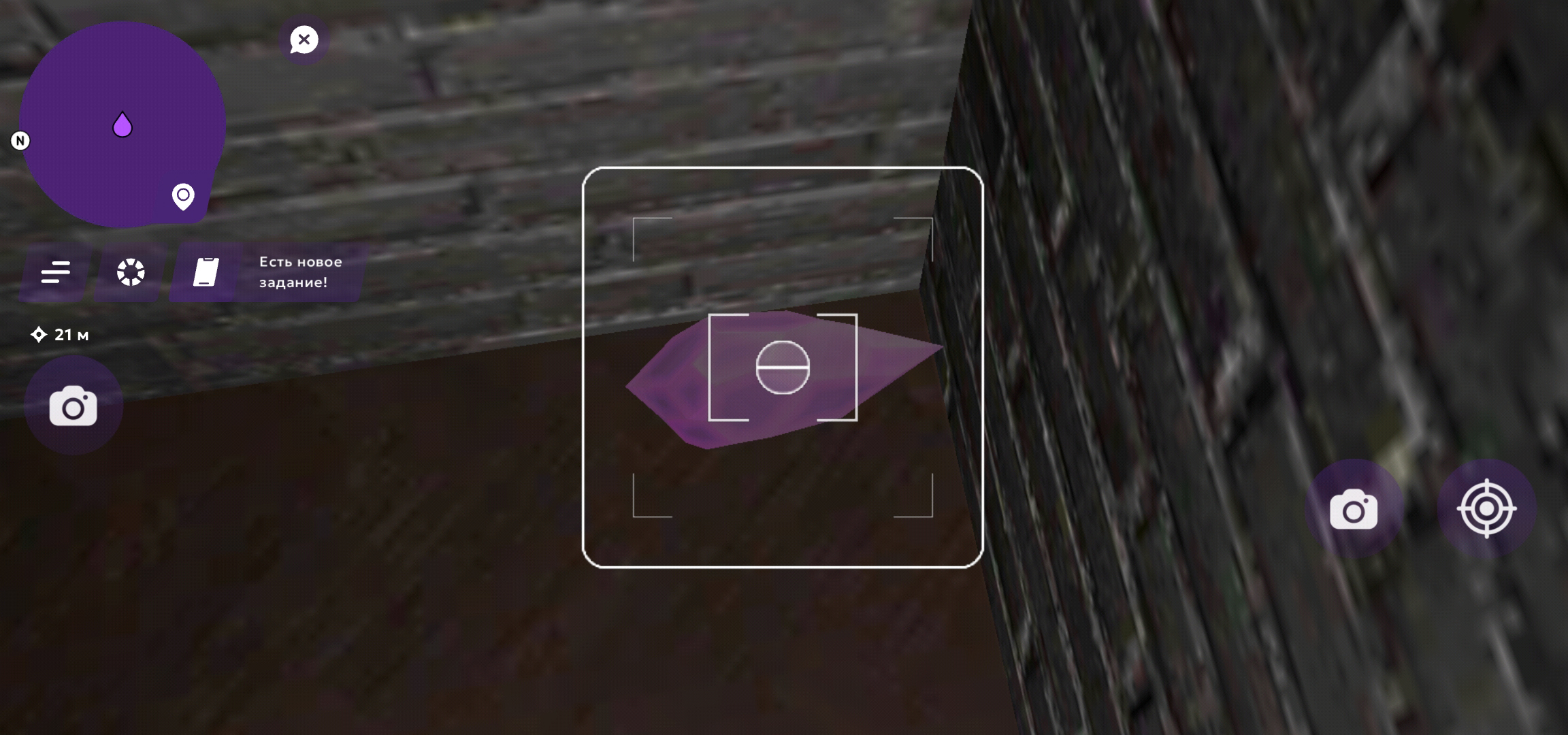 Чтобы сфотографировать кристалл, нажми на иконку прицела и наведи камеру на кристалл. Приблизь кадр так, чтобы кристалл полностью его занимал, так кадр лучше зафиксируется. Чтобы сделать снимок нажми на иконку камеры.